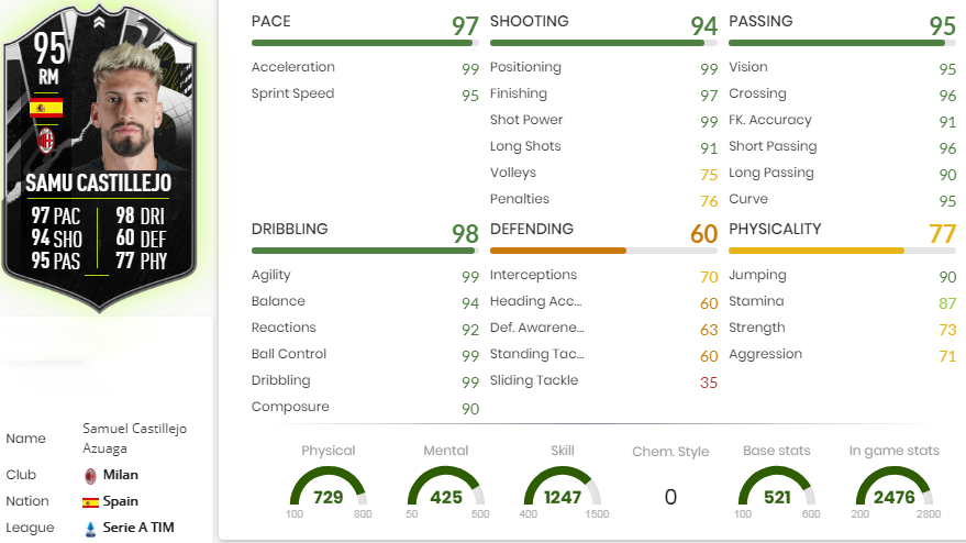 Castillejo, the right midfielder gets first-rate positions in Pace, Shooting,
