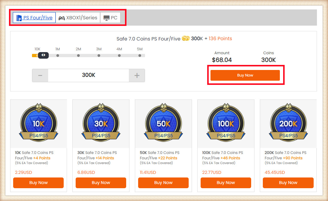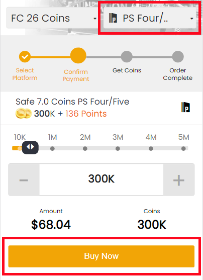 2. Choose your console, enter or select the coins amount you want to buy, then click "BUY NOW".