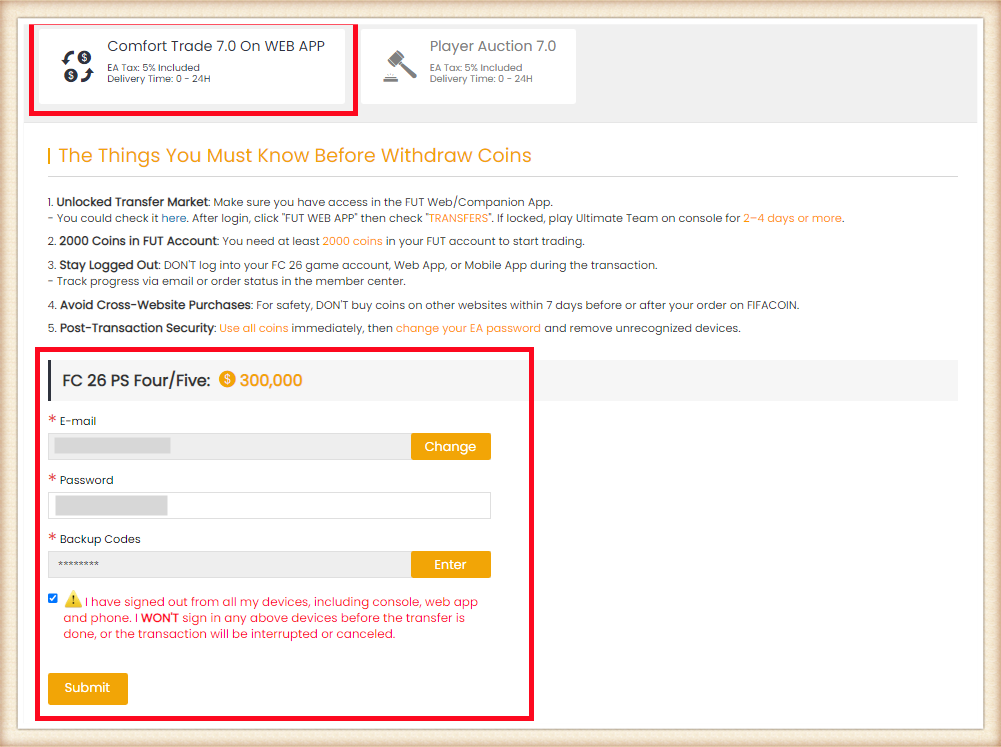 • 5000 Coins in FUT account: You need to have at least 5000 coins in your game to start trading. Having more coins will lead to faster and safer order fulfillment.