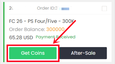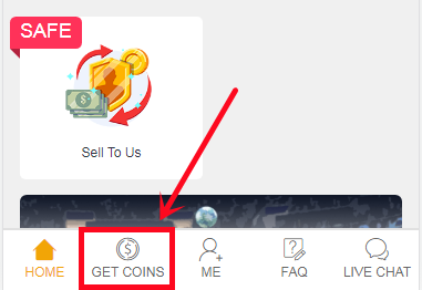4. Turn to "GET COINS" at bottom of the page, find your order, and click "Get Coins".