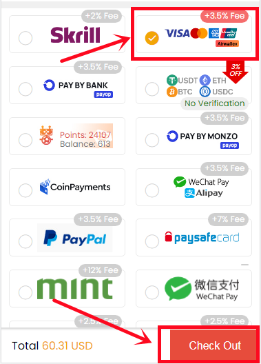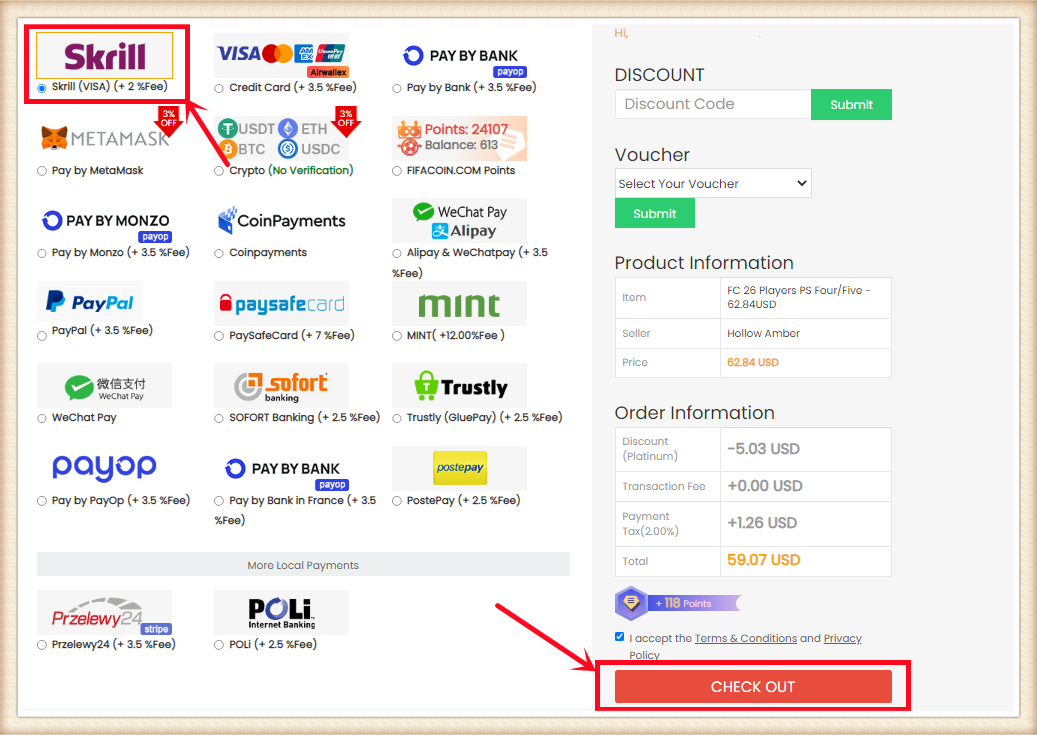 3. اختر طريقة الدفع وتابع إلى CHECK OUT.